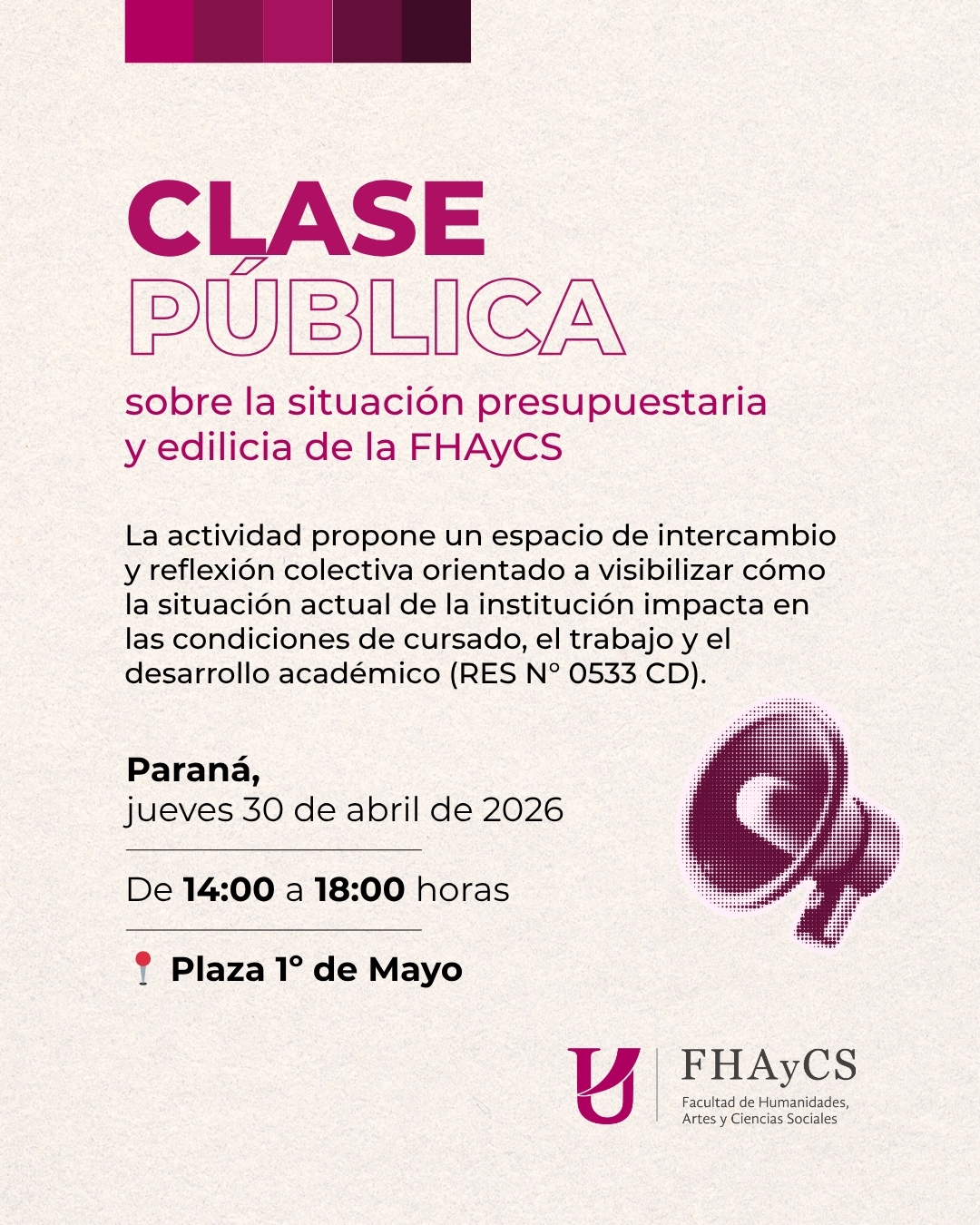 La Facultad de Humanidades de la Universidad Autónoma de Entre Ríos (Uader) realizará este jueves, entre las 14 y las 18, una clase pública en la Plaza 1° de Mayo, en Paraná, para demandar mayor presupuesto y contar con edificio propio que le permita un mejor desarrollo de la tarea de formación. Daniel Richar, decano de Humanidades, dijo al programa Puro Cuento de Radio Plaza 94.7 evaluó: Una situación es consecuencia de la otra. Nosotros decimos acá en Humanidades que todos los edificios nos quedan chicos. En este momento, estamos dictando clases en el Colegio Nacional, que nos prestan las instalaciones; en la Escuela Quirós; en la Escuela Normal; en la Escuela Santa Fe. O sea, en cuatro lugares distintos de la ciudad, y todos esos lugares con muchísimos estudiantes. En la Escuela Normal tenemos a la mayoría de los estudiantes y vemos que se colapsan los baños. El edificio de la Normal pensado para 800 a 1.000 alumnos cuando se construyó. Hoy, estamos en más de 5.000 todos los días. En estas condiciones, tensionamos fuertemente la infraestructura que tenemos. Las aulas, pensadas para 40 alumnos, las ocupamos con 60. Richar aseguró que en esas condiciones no están cómodos quienes enseñan ni quienes estudian. La Uader es una institución muy grande que, cuando se creó, no se pensó en las dimensiones que iba a ir adquiriendo con el tiempo. No hubo ningún tipo de inversión. Es algo muy complejo no estar en unas instalaciones adecuadas para el desarrollo de la vida universitaria, evalúa Richar, que luego resalta el hecho de que el presupuesto no aumenta en Uader. Hemos venido teniendo presupuestos similares año a año, o se actualizan básicamente por algún criterio que siempre es menor a la inflación que actualiza el gobierno de la provincia. Nosotros tenemos casi el 99% del presupuesto asignado a la facultad para el pago de sueldos. O sea, que la facultad funciona con el 1% para todo lo que son insumos, pago de servicios y compras de bienes. No tenemos presupuesto para mantenimiento de nuestros edificios, como la Escuela Normal, la Escuela de Música, la Escuela de Artes Visiuales, la Escuela Alberdi, la Escuela Almafuerte. Tampoco en el resto de la provincia, subraya. En el caso de la Escuela Normal José María Torres, sede del decanato de la Facultad de Humanidades, monumento histórico, no cuenta con recursos para mantenimiento. Entonces -plantea el decano-, se mantiene por el esfuerzo de un grupo de trabajadores que hacen mantenimiento. No debe haber un monumento histórico nacional en ningún lugar del país que no tenga asignado una mínima partida para su mantenimiento. En ese contexto de malestar, agregó, y tras sucesivas presentaciones de parte de estudiantes, el consejo directivo de la Facultad de Humanidades dispuso convocar a clases públicas para exteriorizar la situación por la que atraviesa en cuanto a presupuesto y edificio. Tampoco Humanidades pudo ser reubicada en el Campus de Uader, donde están las facultades de Ciencias de la Vida y la Salud y Ciencias de la Gestión. Uno puede leerlo de distintas formas, pero lo real es que nosotros no tenemos un presupuesto que dé cuenta de la magnitud de la facultad. Si no fuera por el apoyo permanente de la cooperadora de la facultad, no se podría mantener esto. Todos hacemos un esfuerzo para mantener la cursada. que no se entienda como una cuestión de facultad, de una situación entre facultades. Quiero que se entienda: esto no es una disputa entre facultades, de ninguna manera. Tenemos un presupuesto que es insuficiente para el funcionamiento de la universidad, pero la más perjudicada es la Facultad de Humanidades, indicó. De la Redacción de Entre Ríos Ahora