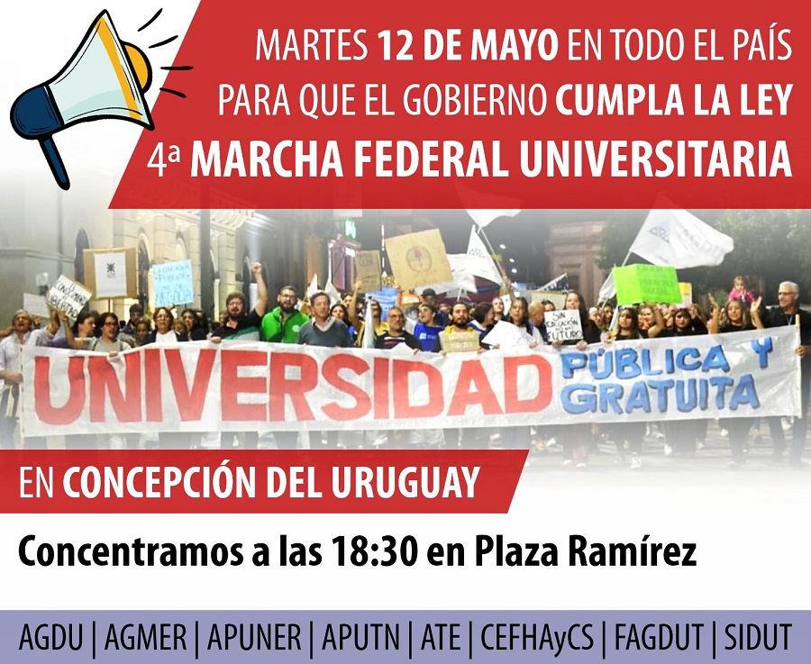 La mesa universitaria de Concepción del Uruguay convoca a toda la comunidad a sumarse a las acciones en defensa del sistema universitario público, hoy amenazado por políticas de ajuste presupuestario que ponen en riesgo su funcionamiento, profundizan el deterioro de las condiciones de vida de sus trabajadores y comprometen el futuro de millones de estudiantes. El martes 12 de mayo se realizará en todo el país la cuarta Marcha Federal Universitaria. La misma es convocada para exigir al gobierno el cumplimiento de la Ley de Financiamiento Universitario (ratificada por amplia mayoría en el Congreso de la Nación) y rechazar las dilaciones y maniobras que continúan desoyendo la voluntad popular. En nuestra ciudad nos concentraremos a las 18:30 en Plaza Francisco Ramírez, frente al Rectorado de la UNER. Nuevamente se torna necesario unir fuerzas con actores de todos los niveles educativos, el sistema de salud, los organismos científicos y tecnológicos, el sector productivo, los colegios profesionales, las pequeñas y medianas empresas y el conjunto de la clase trabajadora, hoy víctimas de las políticas regresivas implementadas por el gobierno nacional y provincial. Las universidades públicas, gratuitas, de excelencia y al servicio de las grandes mayorías son uno de los mayores orgullos de nuestro pueblo y la herramienta fundamental para el desarrollo nacional. Defenderlas es una tarea colectiva y esta vez no puede faltar nadie, por eso el 12 de mayo volvamos a ser miles colmando en unidad las calles de La Histórica. AGDU | AGMER | APUNER | APUTN | ATE | CEFHAyCS | FAGDUT | SIDUT