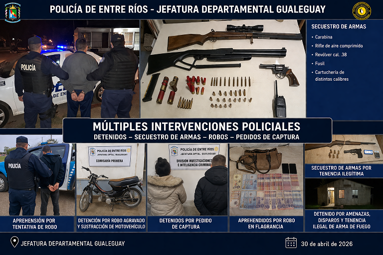 Gualeguay: múltiples intervenciones policiales con detenidos, secuestro de armas y hechos de violencia La Policía de Entre Ríos informó sobre una serie de procedimientos realizados en las últimas horas en jurisdicción de la Gualeguay, que incluyeron detenciones por violencia de género, robos, pedidos de captura y secuestro de armas de fuego. Violencia de género y disparos contra la Policía Durante la madrugada, efectivos acudieron a un llamado al 911 por un caso de violencia de género. Al llegar, la víctima ya se encontraba resguardada fuera de la vivienda junto a su hijo, mientras que el agresor permanecía atrincherado en el interior. Tras una instancia de mediación, el hombre efectuó disparos desde un balcón hacia el personal policial. Finalmente, integrantes de la Guardia Especial lograron reducirlo sin que se registraran heridos. En el domicilio se secuestraron varias armas, entre ellas una carabina, un revólver calibre .38 y un fusil, además de cartuchería. El detenido fue trasladado al hospital y luego alojado en la Jefatura Departamental, quedando a disposición de la Fiscalía de Gualeguay, a cargo del Dr. Schel. Aprehendido en flagrancia por intento de robo En otro procedimiento, personal policial intervino en calles Carmen Gadea y Coronel Correa, donde un hombre fue sorprendido violentando vehículos estacionados. El sujeto fue aprehendido en el lugar y quedó detenido por tentativa de robo por disposición judicial. Detención por robo agravado y sustracción de motovehículo Efectivos de Comisaría Primera detuvieron a un hombre de 29 años acusado de sustraer un motovehículo. Además, se lo vincula con otros hechos recientes de robo agravado con uso de arma de fuego y amenazas. La medida fue ordenada por la Fiscalía en turno. Dos detenidos por pedido de captura desde Puerto Madryn En un operativo realizado por la División Investigaciones, se detuvo a un hombre de 39 años y una mujer de 40 sobre quienes pesaba un pedido de captura vigente por una causa de defraudación. Ambos quedaron a disposición de la justicia de Chubut. Dos aprehendidos por robo en flagrancia en General Galarza Tras el robo del bolso a una mujer de 70 años en la vía pública, personal policial logró ubicar a dos sospechosos en las inmediaciones. Durante el procedimiento se recuperó el bolso y se secuestró dinero en efectivo que llevaban los detenidos. Ambos quedaron imputados por robo en flagrancia. Secuestro de armas en Islas Lechiguanas En el marco de un conflicto por la ocupación de un rancho en Islas Lechiguanas, efectivos de la Brigada de Delitos Rurales secuestraron varias armas sin documentación, entre ellas una escopeta calibre 16, un silenciador y un rifle de aire comprimido. Se iniciaron actuaciones por tenencia ilegítima de armas. Detenido por amenazas, disparos e intento de incendio En otro hecho ocurrido en la zona de islas, un hombre fue detenido tras amenazar a un vecino, efectuar disparos y rociar combustible sobre una vivienda con intenciones de incendiarla. El agresor fue aprehendido con una escopeta recortada, cartuchos y un arma de aire comprimido. Por disposición de la Fiscalía, quedó detenido por tenencia ilegal de arma de fuego y se iniciaron actuaciones por tentativa de homicidio. Las autoridades indicaron que todos los procedimientos continúan bajo investigación judicial para esclarecer responsabilidades y avanzar en las causas correspondientes.